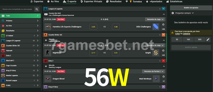 O 56W oferece uma grande seleção de opções de apostas em e-sports com probabilidades competitivas